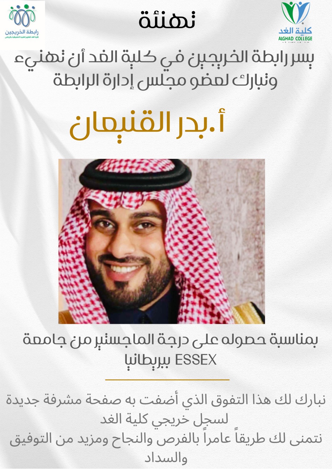 تهنئه: تهنئ رابطة الخريجين أ. بدر القنيعان بمناسبة نيله درجة الماجستير من جامعة ESSEX ببريطانيا